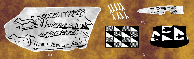 Examples of ornaments with the symmetry group p1 in Paleolithic and Neolithic art: (a) Chaffaud cave, Paleolithic (Magdalenian); (b) Paleolithic bone engravings, around 10000 B.C.; (c) Hacilar, ceramics, around 5700-5000 B.C.