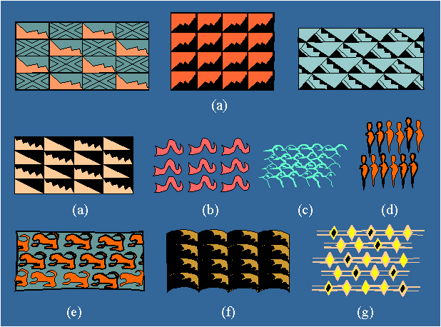 Examples of ornaments with the symmetry group p1: (a) Hacilar, around 5700-5000 B.C.; (b) Velushko-Porodin, Yugoslavia, around 5000 B.C.; (c) Western Pakistan, around 3000 B.C.; (d) Naqda culture, Egypt, around 3600-3200 B.C.; (e) the pre-dynastic period of Egypt; (f) art of pre-Columbian America, Nasca, Peru; (g) the ornament "Warms", the ethnical art of Africa.