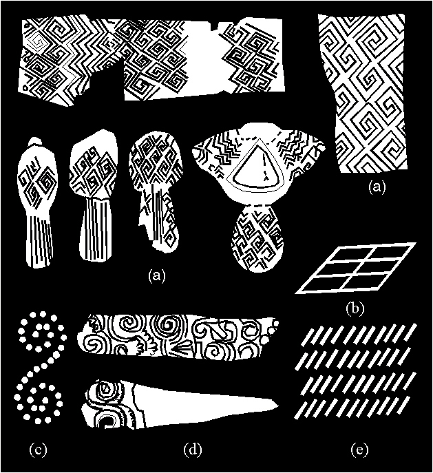 Ornaments with the symmetry group p2 in ornamental art: (a) application of a double spiral, rosette C2 (2) in the ornaments of the Aegean cultures and Egypt; (b) Knossos; (c) the art of the pre-Columbian period, Peru; (d) the art of the Pueblo Indians; (e) the ethnical art, Indonesia.