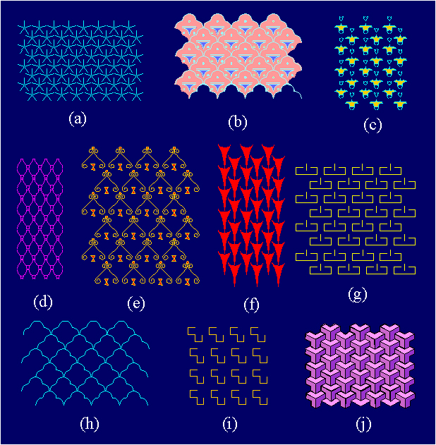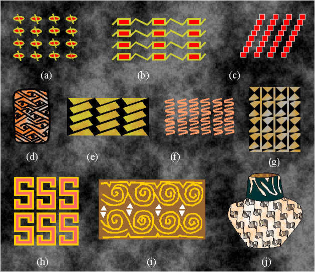 Examples of ornaments with the symmetry group p2 in Neolithic art: (a) Tepe Guran, around 5800 B.C.; (b) Siyalk II, around 4000 B.C.; (c) Samara, around 5500 B.C.; (d) Catal Hüjük, around 6400-5800 B.C.; (e) the Neolithic of the Middle East; (f) the Neolithic of Iran and Egypt; (g) Neolithic of the Middle East; (h) Dimini, Greece, around 6000 B.C.; (i) Neolithic, Czechoslovakia, around 5000-4000 B.C.; (j) Odzaki, Greece, around 6100-5800 B.C.