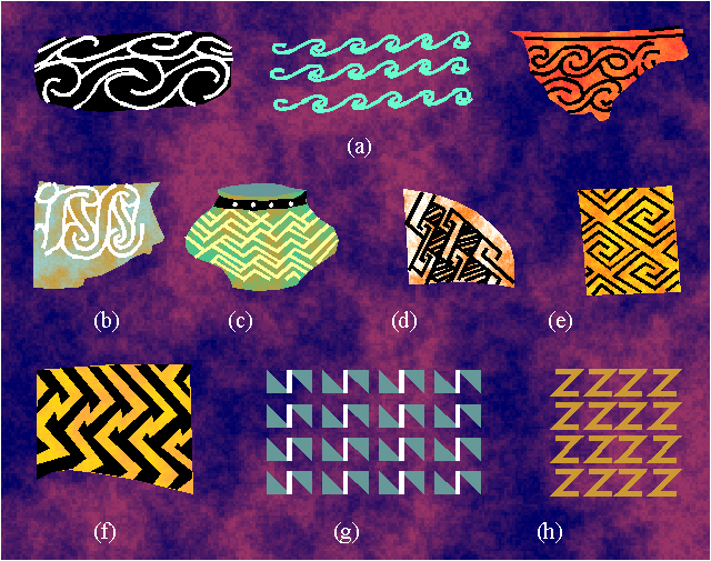 Examples of ornaments with the symmetry group pg: (a) Nuzi ceramics, Minoan period; (b) Mussian, Elam, around 5000 B.C.; (c) Hallaf, around 6000 B.C. (7600-6900 B.C.?); (d) Eridu culture, around 4500-4200 B.C.; (e) Hacilar, around 5700-5000 B.C.; (f) Naqda culture, Egypt, around 3600-3200 B.C.; (g) Adriatic zone, around 3000-2000 B.C.; (h) Iran, around 5000 B.C.