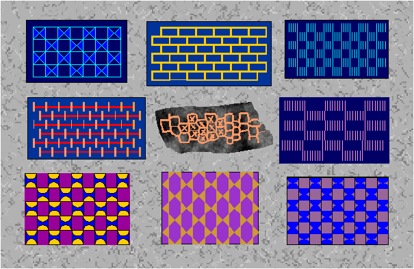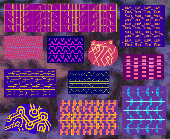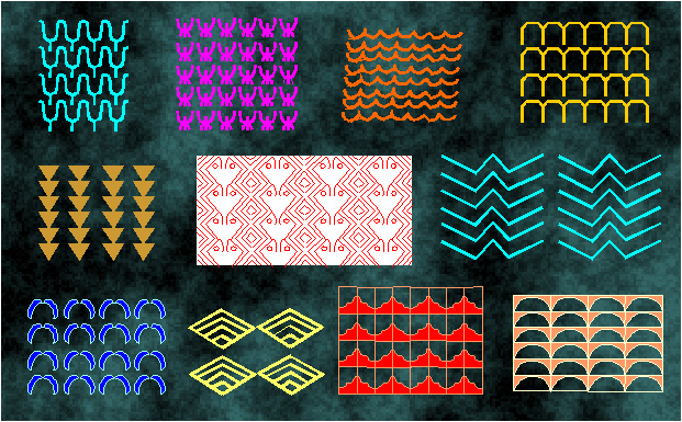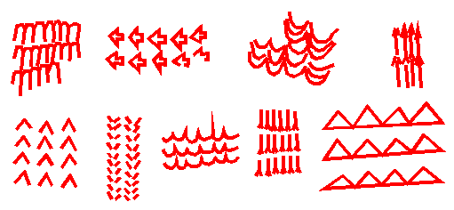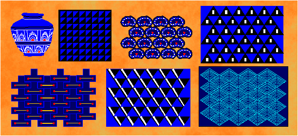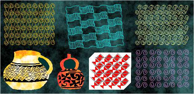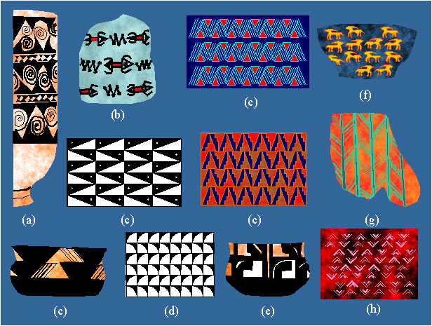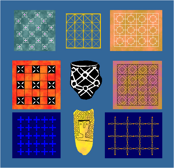 Examples of ornaments with the symmetry group cmm in Neolithic art (Susa, Hajji Mohammed, Siyalk, Hacilar, Lendel culture, around 6000-3000 B.C.).