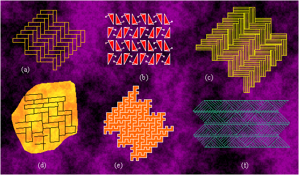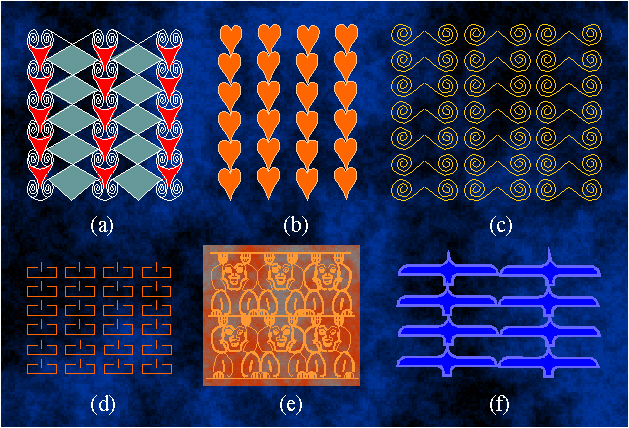 Ornaments with the symmetry group pm: (a) Egypt, 18th dynasty; (b) Bubastis, Egypt, 1250 B.C.; (c) Troy, around 1500 B.C.; (d) the ethnical art of the Eskimos, Alaska, around 1825; (e) Japan; (f) the Mittla palace, the pre-Columbian period of America.
