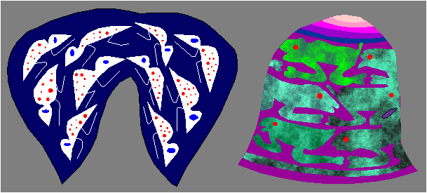 Similar to the corresponding symmetry group of friezes m1, the symmetry group of ornaments p3m1 contains reflections with reflection lines perpendicular to the generating translation axis, that cause the non-polarity of the axis. Therefore, in a geometric and visual-symbolic sense, the symmetry group p3m1 can be considered as a static equivalent of the symmetry group p31m. The fundamental region of the symmetry group p3m1 is an equilateral triangle. The symmetry group p3m1 (D) is generated by reflections, that require a rectilinear triangular fundamental region and restrict the area of the corresponding classical-symmetry ornaments to the use of some elementary asymmetric figure belonging to a fundamental region, resulting in a marked isohedral tiling (B. Grünbaum, G.C. Shephard, 1987). No desymmetrization of a fundamental region of the symmetry group D3 (3m) can be achieved by changing its shape. Therefore, an internal desymmetrization of the fundamental region becomes indispensable, making impossible a visual interpretation of the symmetry group p3m1 accompanied by an isohedral tiling, without a previous internal desymmetrization of the fundamental region. A fundamental region must be rectilinear in all the groups generated by reflections: pmm, p4m, p6m and p3m1. Except the symmetry group p3m1, this fact has no influence on the possibility to construct an isohedral tiling with a tile serving as the fundamental region of the symmetry group discussed. Only in the symmetry group p3m1, where this tiling is a regular tessellation {3,6} , there comes the symmetrization by composing six equilateral triangles with a common vertex and each with the symmetry group D3 (3m). The result is the isohedral tiling with the symmetry group p6m. Therefore, in ornamental art, the symmetry group p3m1 occurs seldom, especially in the earlier period (Figure 2.90c). Distinct from classical-symmetry ornaments with the symmetry group p3m1, antisymmetry ornaments with the antisymmetry group p6m/p3m1, in the classical theory of symmetry treated as ornaments with the symmetry group p3m1, are some most frequent antisymmetry ornaments. The antisymmetry group p6m/p3m1 can be derived by the antisymmetry desymmetrization of the symmetry group p6m, where the adjacent equilateral triangles of a regular tessellation {3,6} are colored oppositely (Figure 2.102n). Their generating symmetry group p6m is one of the most frequent symmetry groups in the whole of ornamental art, while their constructional and visual simplicity caused the frequent occurrence of ornaments with the antisymmetry group p6m/p3m1.