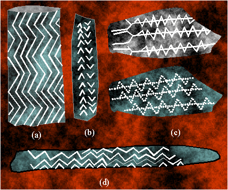 Examples of ornaments with the symmetry group pmg in Paleolithic art: (a) Mezin, USSR, around 12000-10000 B.C.; (b) the Paleolithic of Europe; (c) Pernak, Estonia, around 10000 B.C.; (d) Shtetin, Magdalenian period.