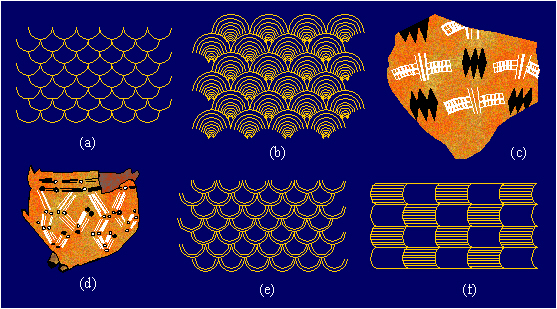 Examples of ornaments with the symmetry group cm in Neolithic art: (a) Susa, around 6000 B.C.; (b) Hallaf, around 6000 B.C.; (c) Haldea, around 5000 B.C.; (d) Nezvisko, USSR, around 5000 B.C.; (e) Hallaf; (f) antisymmetry ornament with antisymmetry group pm/cm, treated by the classical theory of symmetry as the symmetry group cm, Hallaf.