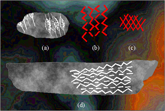 Generators define a possible form of a fundamental region, so that the incidence of a reflection line with a segment of the boundary of the fundamental region means that such a part of the boundary must be rectilinear. A fundamental region must be rectilinear in the symmetry groups of ornaments generated by reflections - pmm, p3m1, p4m, p6m. All the other symmetry groups of ornaments offer the use of curvilinear boundaries or curvilinear parts of boundaries of a fundamental region, which do not belong to reflection lines. The question of the form of a fundamental region is directly linked to the perfect plane forms - monohedral tilings, plane tilings by congruent tiles. This problem constantly attracts mathematicians and artists (B. Grünbaum, G.C. Shephard, 1987). In ornamental art it came to its fullest expression in Egyptian and Moorish ornamental art and in the graphic works by M.C. Escher (M.C. Escher, 1971a, b, 1986; B. Ernst, 1976; C.H. Macgillavry, 1976) . For the symmetry groups of ornaments generated by reflections pmm, p4m and p6m, the problem of isohedral tilings is simply reduced to a rectangular lattice (pmm) and regular tessellations {4,4} (p4m), {3,6} or {6,3} (p6m). There is a certain anomaly in the symmetry group p3m1 (D). Owing to a symmetrization, its corresponding tessellation {3,6} possesses the symmetry group p6m. Therefore, this is the only symmetry group of ornaments not offering any possibility for the corresponding isohedral unmarked tilings and requiring the use of an asymmetric figure within a fundamental region, this means, a marked tiling. This contradiction can be solved by taking rotation centers always inside the tiles, so that the symmetry group p3m1 will correspond to a regular tessellation {3,6} , and the symmetry group p6m to a regular tessellation {6,3} . Under such conditions the symmetry group p3m1 belongs to the family of the symmetry groups of ornaments appearing in Paleolithic ornamental art, since the regular tessellation {3,6} dates from the Paleolithic (Figure 2.92b).