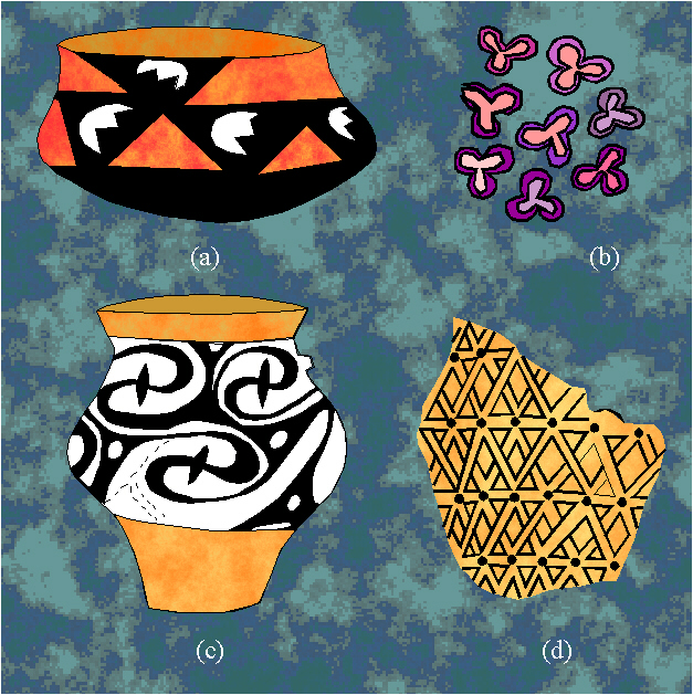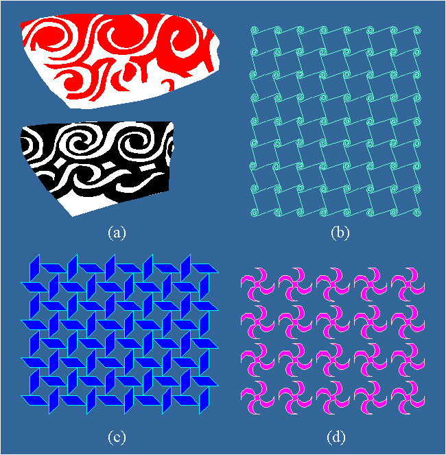 Ornaments with the symmetry group p6: (a) Butmir, around 4000 B.C.; (b) Pseira; (c) Cyclades, around 2500 B.C.; (d) Crete and Egypt.