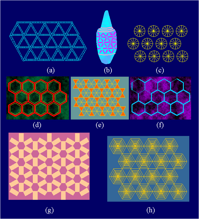 Ornaments with the symmetry group p6m: (a) Egypt, early dynastic period; (b) Sakara, around 2680 B.C.; (c) Egypt, around 1450 B.C.; (d) Tepe Guran, around 6000 B.C.; (e) Susa, around 6000 B.C.; (f) Samara, around 5000 B.C.; (g) Middle East, around 5000-4000 B.C.; (h) Greco-Roman mosaic.