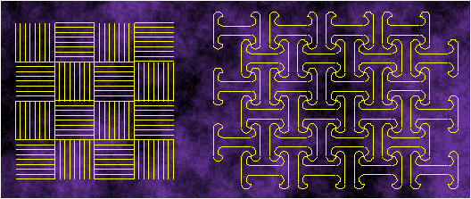 The square crystal system consists of the symmetry groups of ornaments p4 (Figure 2.94), p4g (Figure 2.95-2.97) and p4m (Figure 2.98-2.101). Frequent examples of ornaments with the symmetry groups of the square crystal system are mainly a result of the constructional and visual simplicity of a square lattice - regular tessellation {4,4} - on which these ornaments are based. The oldest examples of a square lattice date from the Paleolithic stone or bone engravings. By uniting two fundamental properties - division of a plane into squares, and perpendicularity - a regular tessellation {4,4} possesses the maximal symmetry group p4m of the square crystal system and serves as a basis for the construction of all ornaments with the symmetry groups belonging to this crystal system. Because all discrete symmetry groups of ornaments, except the groups of the hexagonal crystal system based on regular tessellations {3,6} or {6,3} , are its subgroups, the symmetry group p4m and its corresponding square regular tessellation {4,4} can serve as a starting point for the derivation and visual interpretation of all the subgroups mentioned by the desymmetrization method. The symmetry group p6m corresponding to regular tessellations {3,6} and {6,3} possesses a similar property and contains as subgroups, except the groups of the square crystal system, all the remaining discrete symmetry groups of ornaments. Owing to its visual and constructional simplicity, a regular tessellation {4,4} and the corresponding symmetry group p4m has become the richest source for deriving symmetry groups of ornaments by the desymmetrization method. Regular tessellations {3,6} , {6,3} and the corresponding symmetry group p6m will serve only for constructing ornaments with symmetry groups of a lower degree of symmetry, which cannot be realized by the desymmetrization method from a regular tessellation {4,4} - this means, for deriving by the desymmetrization method, the symmetry groups p3, p31m, p3m, p6 and p6m of the hexagonal crystal system.