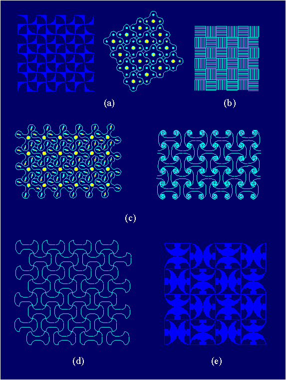 Examples of ornaments with the symmetry group p2 in Paleolithic art, around 12000-10000 B.C.: (a) Mezin, USSR; (b) the Paleolithic of Western Europe; (c) the motif of the double spiral, Mal'ta, USSR; (d) the application of the motif of the double spiral, Arudy, Isturiz; (e) the Paleolithic art of Europe.